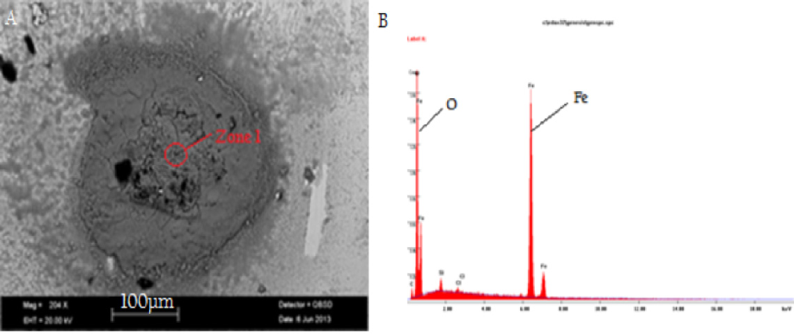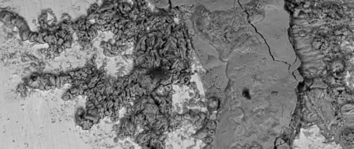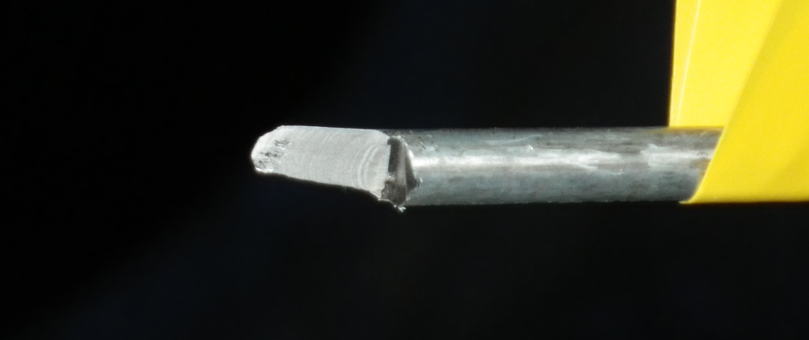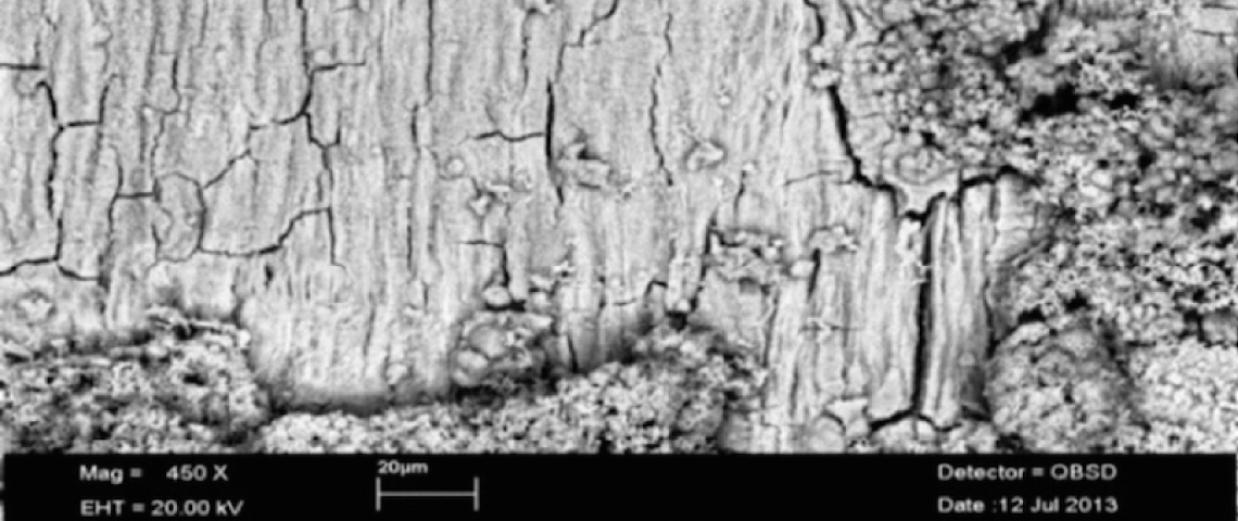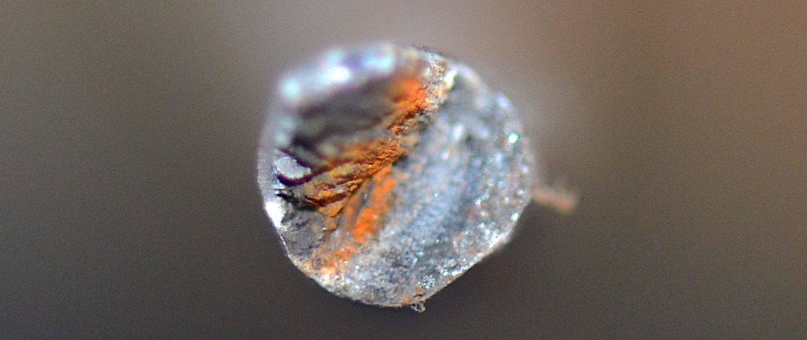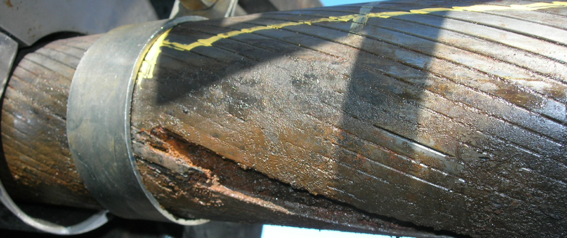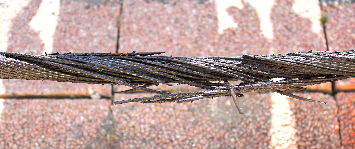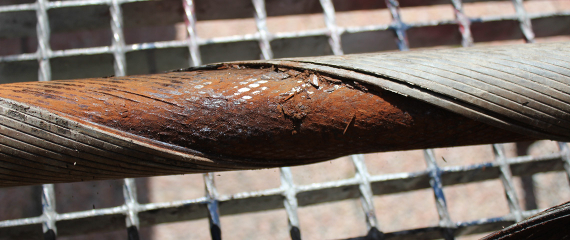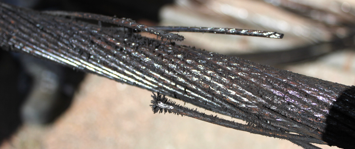 La deuxième couche de fils Z dénudée permet de visualiser une importante lentille de corrosion à la forme elliptique caractéristique d'un mécanisme de fretting-corrosion où la pression de contact de Hertz entre les fils est très importante. La lentille de corrosion se propage vers les couches internes de fils ronds jusqu'à la quatrième couche de l'âme métallique.